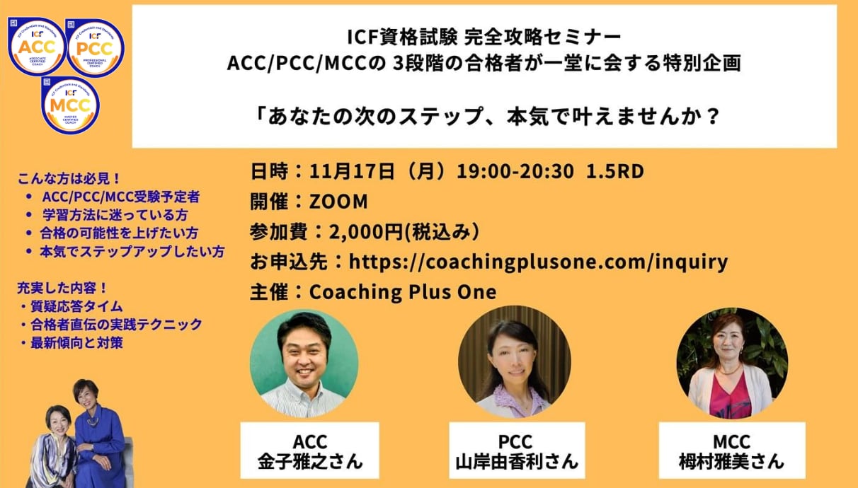ICF資格試験 完全攻略セミナー ACC/PCC/MCCの3段階の合格者が一堂に会する特別企画 「あなたの次のステップ、本気で叶えませんか?」